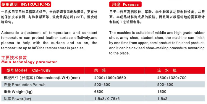 用于中檔至高檔膠鞋、軍鞋、學生鞋等多功能制鞋設備,從幫面、半成品材料到成品的膠鞋,而且可以根據(jù)場地的需要設計制鞋的工藝流程制作。