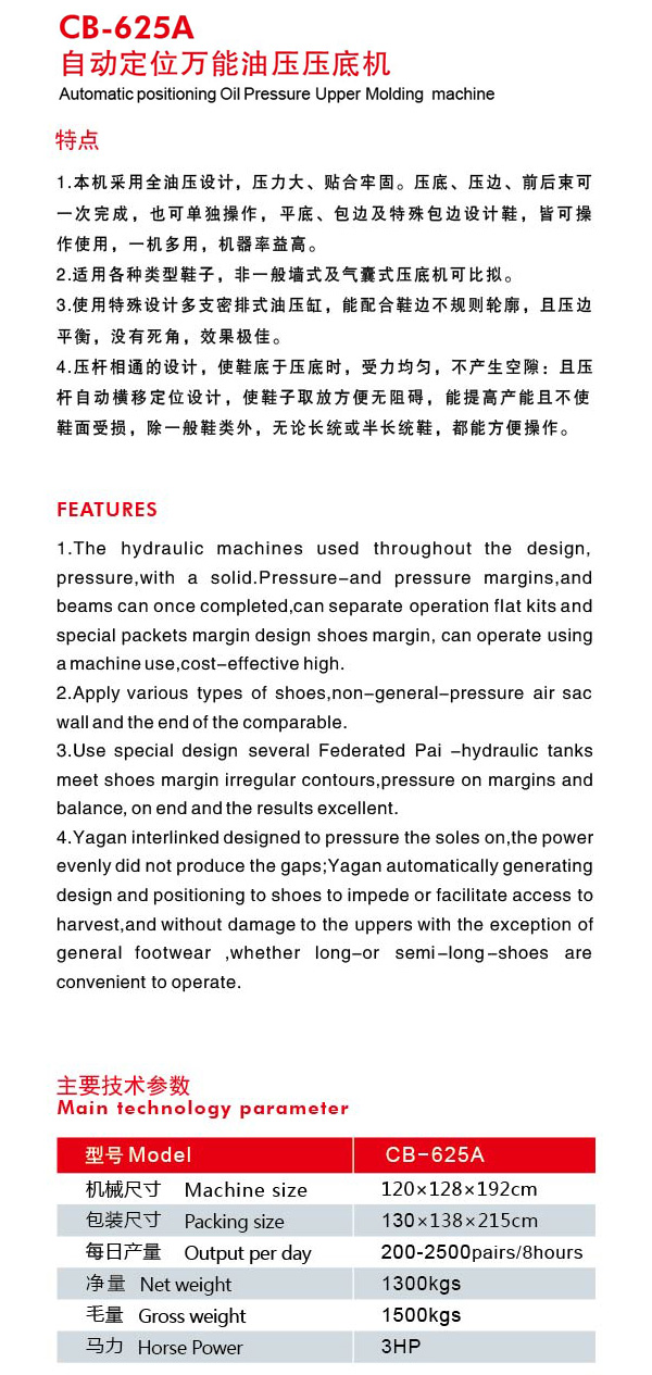 CB-625A自動定位萬能油壓壓底機當前位置:首頁 > 冷粘線設(shè)備 >> CB-625A自動定位萬能油壓壓底機