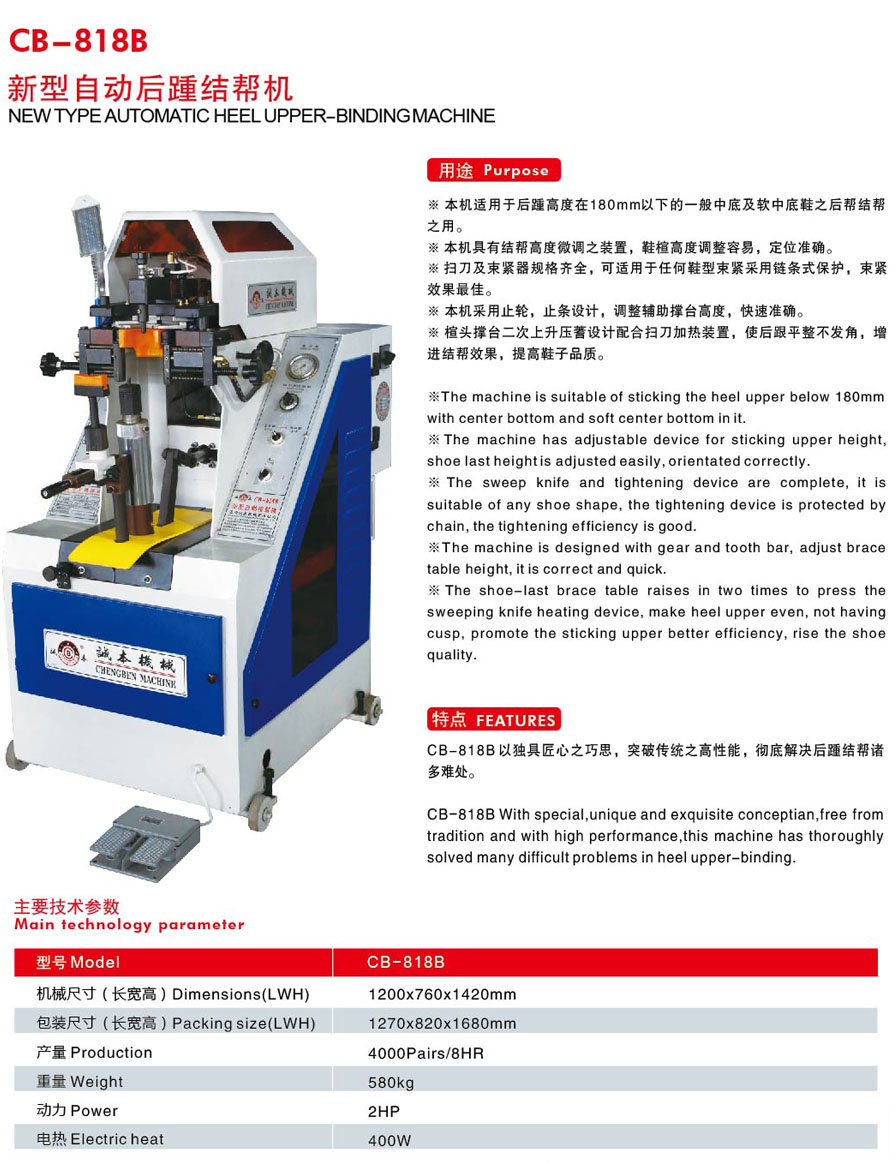 CB-818B后幫機以獨具匠心之巧思,突破傳統(tǒng)之高性能,徹底解決后踵結(jié)幫諸多難處。
